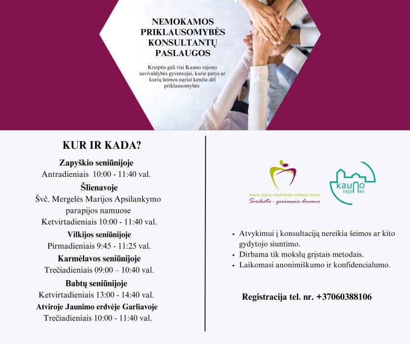 🔹Pagalba dėl priklausomybių. Kauno rajono Visuomenės sveikatos biuras teikia pagalbą, kuri skirta visiems, kurie patys susiduria su priklausomybe arba turi šeimos narių, kenčiančių nuo priklausomybių. 📞 Registracija: +370 603 88106
