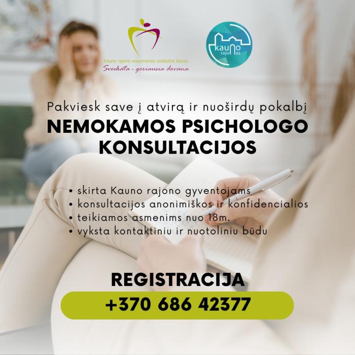 🔹Nemokamos psichologo konsultacijos (nuo 18 m.). Kauno rajono Visuomenės sveikatos biuras suteikia 5 individualias nemokamas konsultacijas bei užtikrina galimybę konsultuotis anonimiškai.