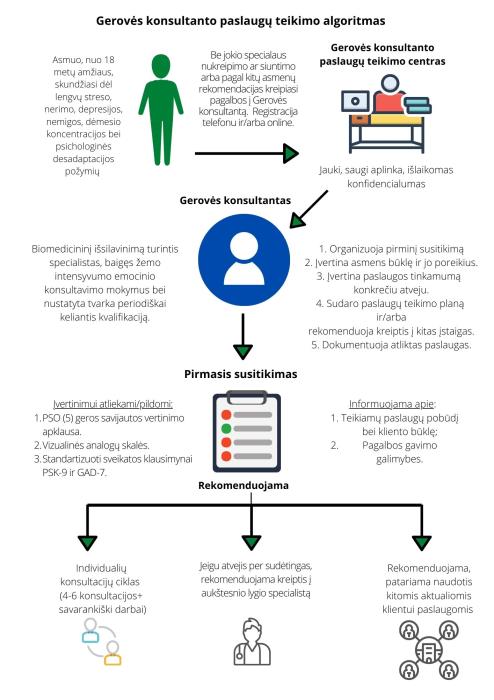 🔹 Gerovės konsultantas (18+ m.). Skirta gyventojams, patiriantiems stresą, nerimą, nemigą bei lengvos depresijos ar prisitaikymo sunkumus.