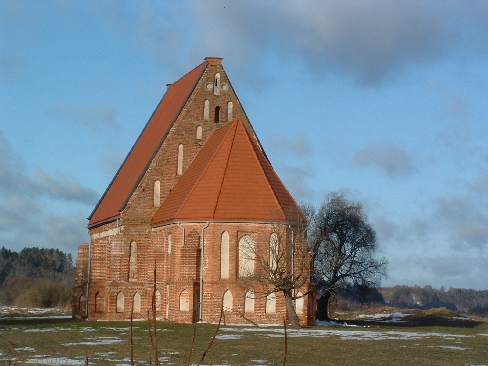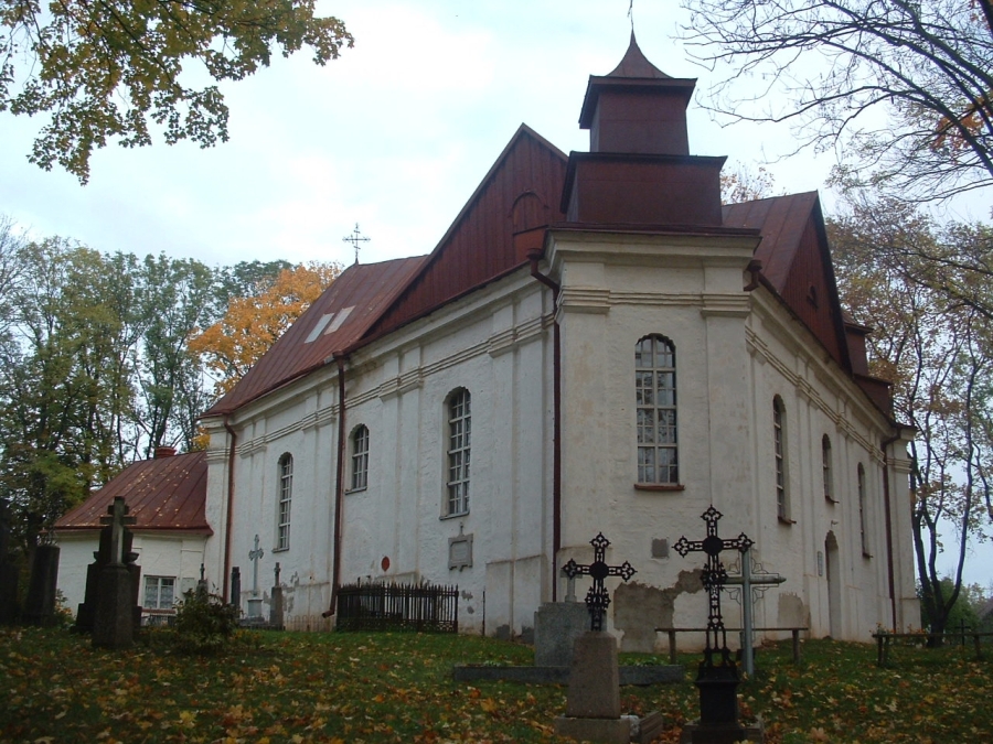Interjeras buvo išpuoštas sienine tapyba. Gotikinės mūrijimo sistemos vietomis nesilaikyta, plytos sumūrytos netvarkingai. Fasaduose beveik nėra vientisų horizontalių ir vertikalių linijų, stačių kampų. Manoma, kad bažnyčią statė vietos mūrininkai, kuriems vadovavo gerai gotikinės kompozicijos principus išmanantis meistras. Pagrindinį vakarų fasadą horizontalios juostos dalija į tris tarpsnius: cokolį, vidurinę dalį ir frontoną. Prie kairiojo kampo prigludęs nedidelis laiptų priestatas. Fasado viduryje, stačiakampėje nišoje, yra smailiaarkis portalas, virš jo (taip pat stačiakampėje nišoje) truputį pastumtas nuo ašies – pusapskritis langas. Fasadą skaido aukštos nišos: cokolyje smailiaarkės, vidurinėje dalyje stačiakampės. Aukštas frontonas, sprendžiant iš pėdsakų, anksčiau, matyt, buvo laiptuotas. Jame taip pat daug stačiakampių ir smailiaarkių nišų, išdėstytų trimis į viršų smailėjančiomis eilėmis. Pietinis ir šiaurinis fasadai beveik vienodi. Kompoziciją sudaro aukštas stiegių stogas. Sienose pabrėžtas vertikalus langų, nišų ir kontraforsų ritmas. Kontraforsai – trijų skirtingo skerspjūvio tarpsnių. Presbiterijos kontraforsai grakštesni nei navų. Fasaduose daug profiliuotų plytų. Tiesa, jos tik trijų rūšių, bet iš jų sudarytos įvairios portalų, langų ir nišų apvadų, juostų ir karnizų kompozicijos. 1993 m. išleistas bažnyčiai skirtas pašto ženklas (dail. Eugenijus Gūzas).
